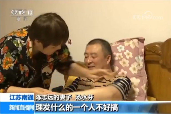 陳志遠的妻子 湯水芬:他自己不能走,要攙著走,家里只有我一個人,幫他洗澡理發一個人不好搞。有時候就不洗,讓他臟一點。
